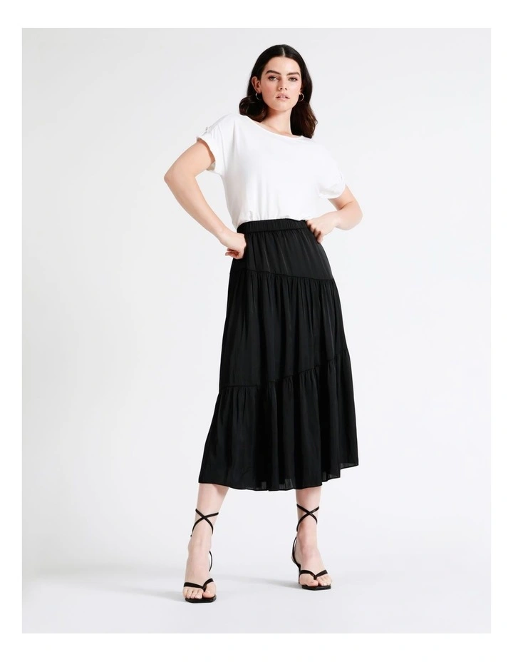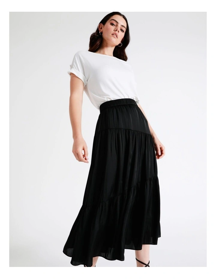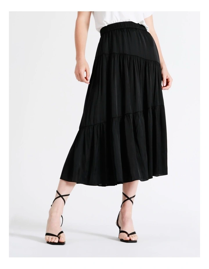 BasqueΒ Shirred Waist Recycled Bruised Poly Satin Tiered Skirt In Black