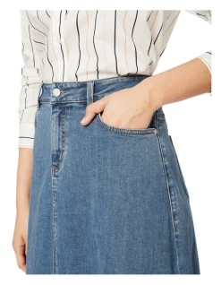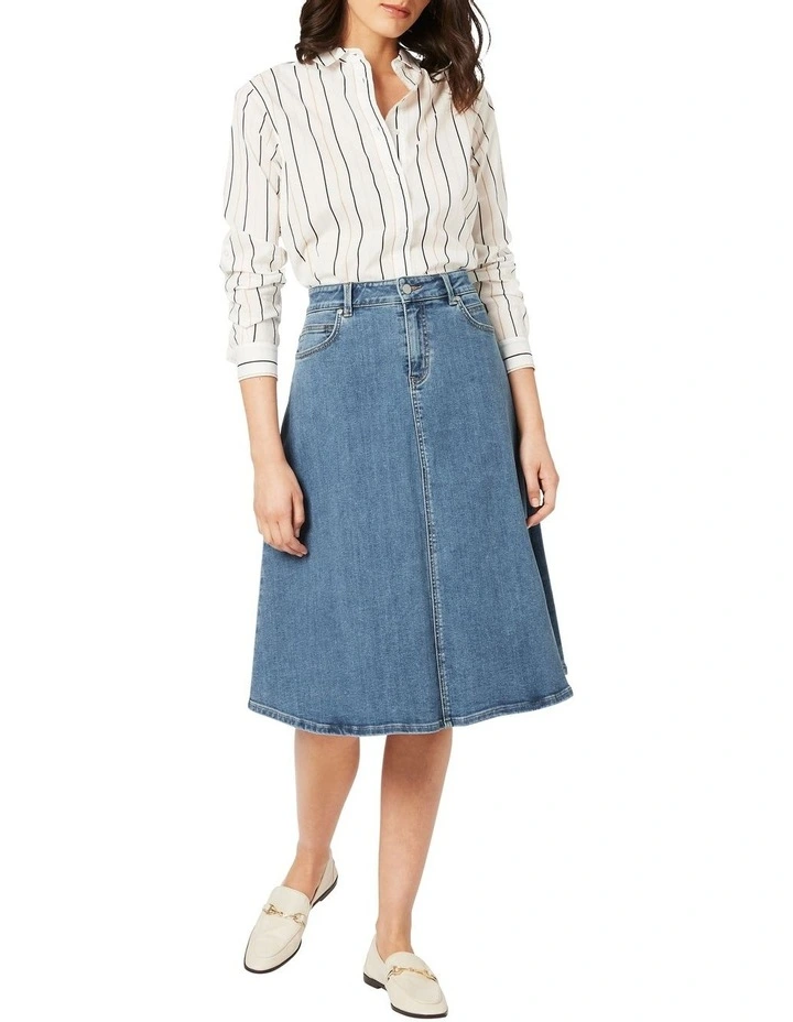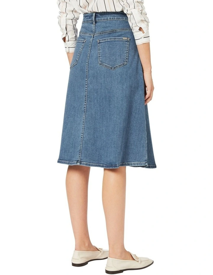 Flared through the hem, this denim skirt curves close through the waist and hips, to create a flattering A-line shape at midi length. Made from a cotton blend denim with stretch for movement, the skirt reveals a light indigo colouring, while showing off design details that include a fly-and-button front closure and classic five pocket jean styling.