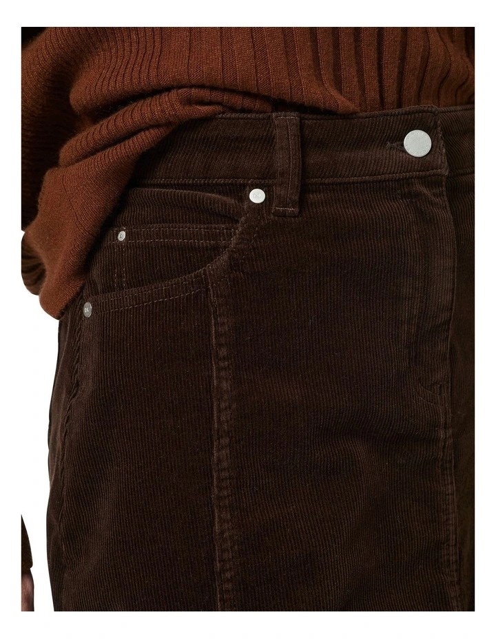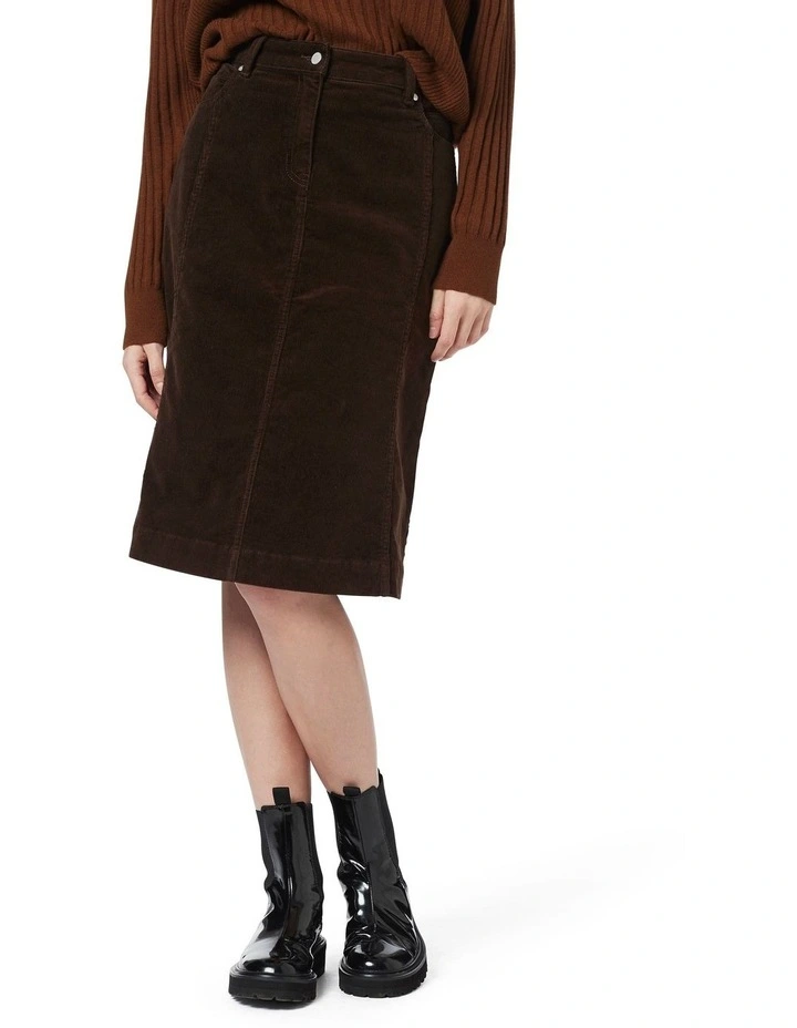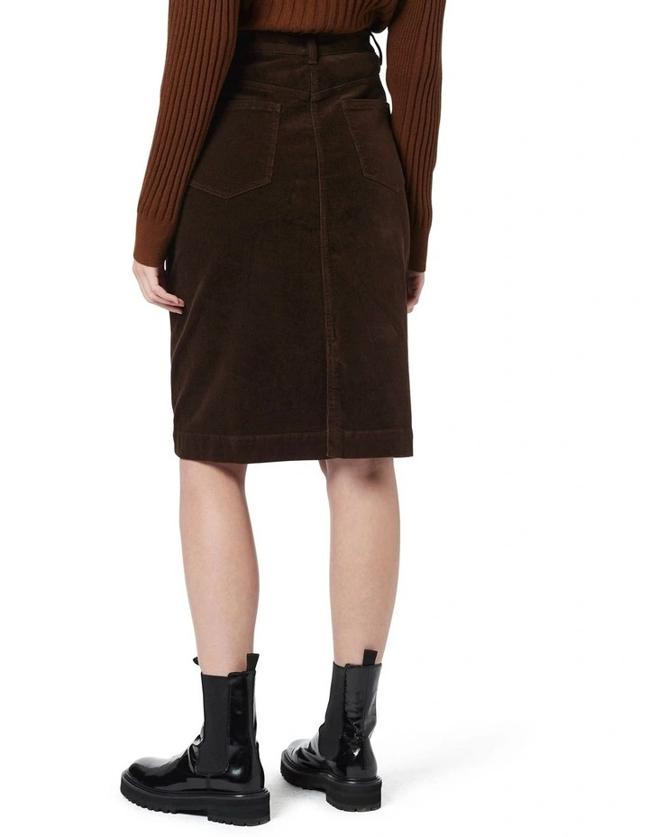 Descending through a classic mid-rise fit, this cord midi skirt uses panelling to flare out to a flattering A-line shape, offering just a hint of stretch for easy movement. Revealing a rich chocolate colour, the skirt shows off a soft, brushed effect within its cotton corduroy fabrication, with further detail found in its front fly-and-button fastening and five pocket styling.
