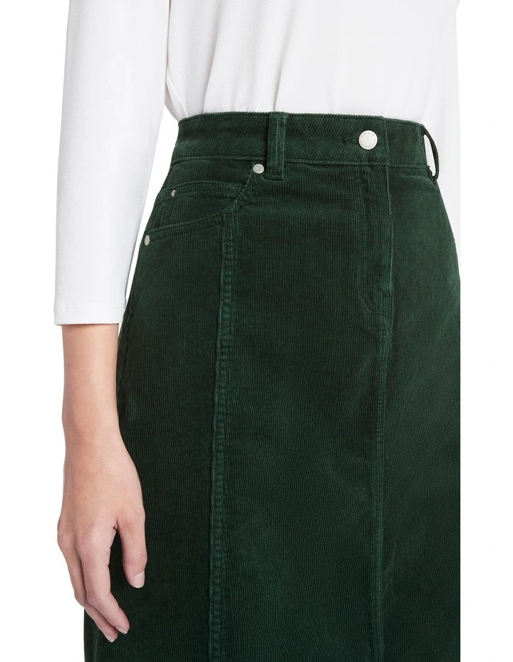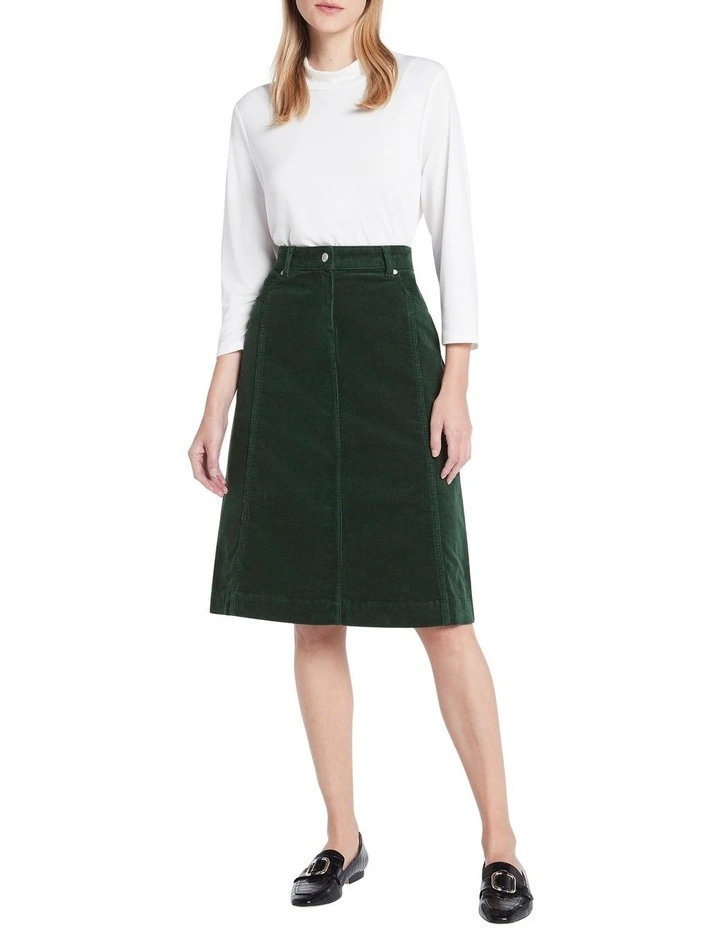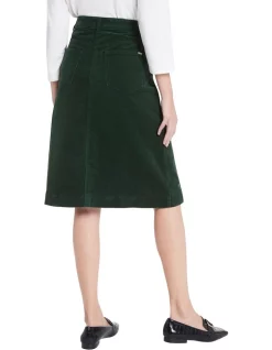 Showing off one of this seasons must-have fabrics, this corduroy skirt feels gorgeously soft to the touch, offered in a rich pine green colouring. Flattering effortlessly within wide A-line shaping, the skirt fastens at the front with a button and concealed fly closure, completed by belt loops at the waist, and pocketing front and back.