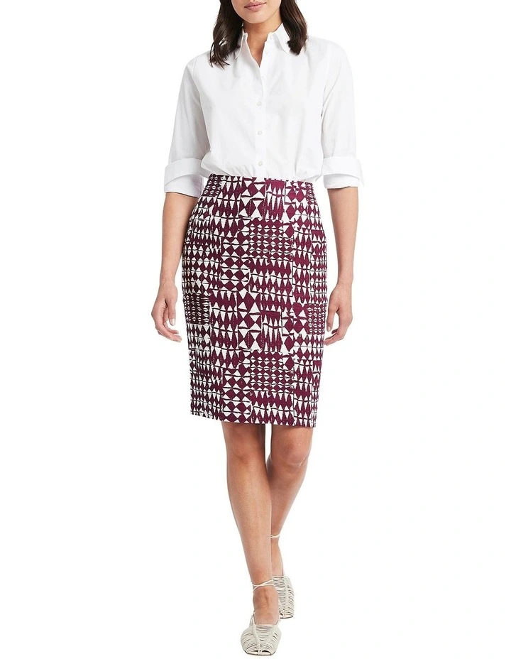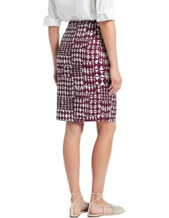 Descending through a neatly concealed waistband, this skirt curves close over the hips to reveal a flattering pencil style, to just above knee length. Fully lined, the skirt moves easily through a stretch linen blend, while showing off an intricate all-over print in plum and ivory, alongside details that include a centre-back invisible zip closure and split at the back hem.