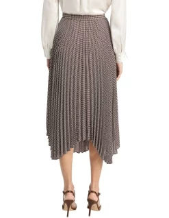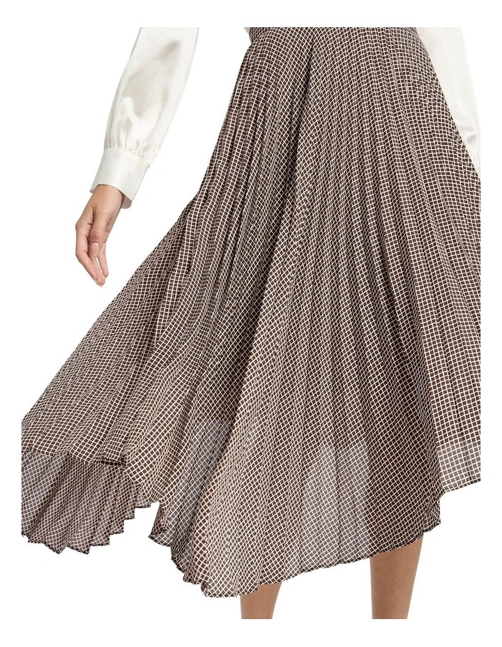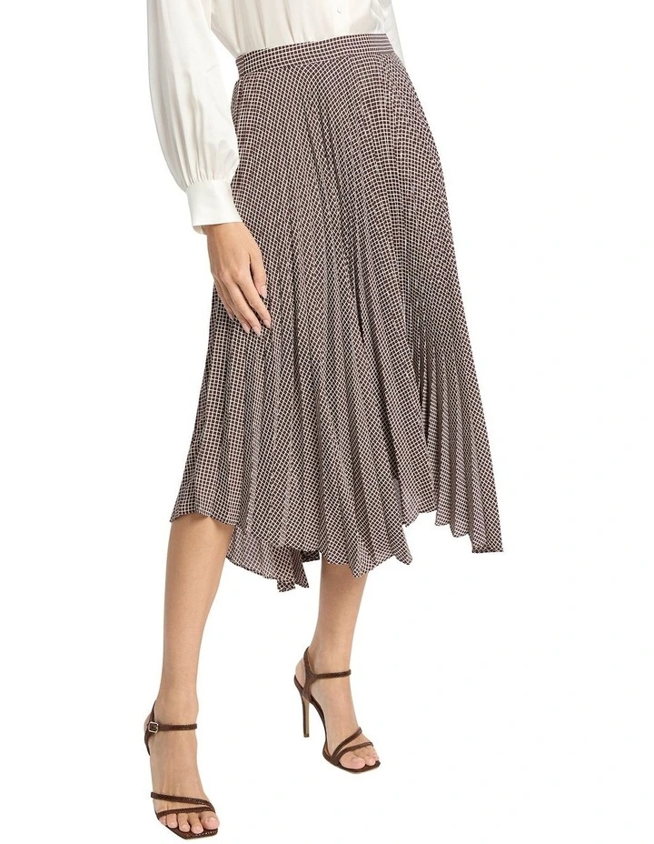 Flaunting an intricate check in shades of ivory and mocha, this skirt creates an easy sense of movement as it flows to midi length, where an asymmetrical hemline adds to its lightweight look. Fully lined, the skirt features soft pleats throughout, with further detail found in a neat fixed waistband with invisible zip fastening at the side seam.