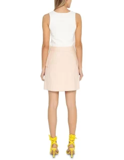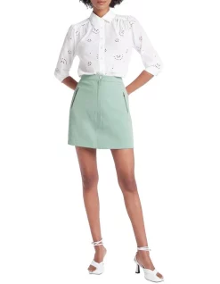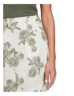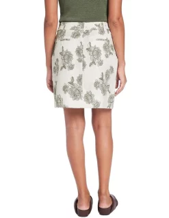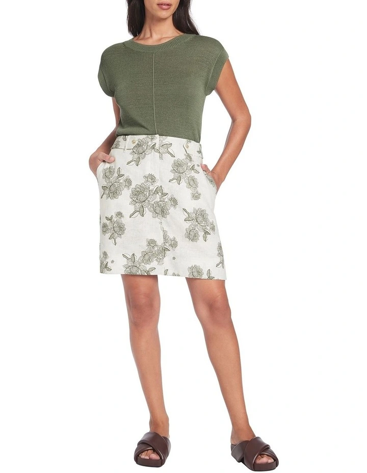 Delicately detailed in its beautiful floral print, this ecru mini skirt flows softly through pure linen, revealing neat shaping within an A-line silhouette. Fastening with a concealed front closure, the skirt is further enhanced by side seam pockets at the hip, welt pockets at the rear, and a decorative three-quarter belt that fastens at the hip with complementary buttons.