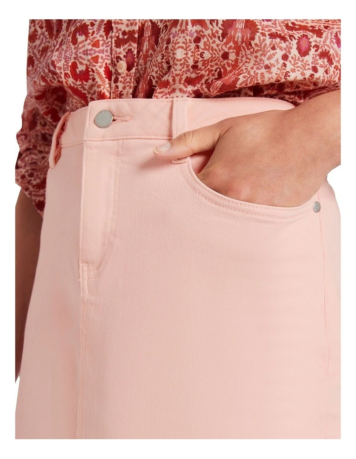Effortlessly pairable in an attractive pale peach wash, this denim skirt curves close through soft stretch cotton denim to descend to a flattering knee length. Fastening at the front with a button and concealed fly closure, the skirt draws the eye to further detailing at the topstitched centre seam, five pocket jean styling, and split at the hem at centre-back.