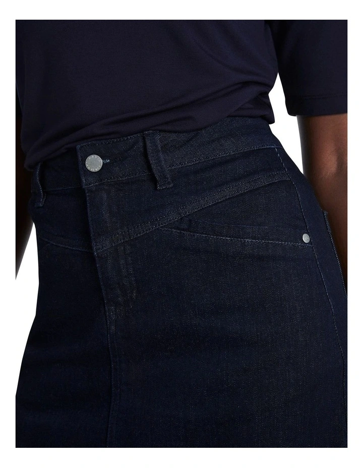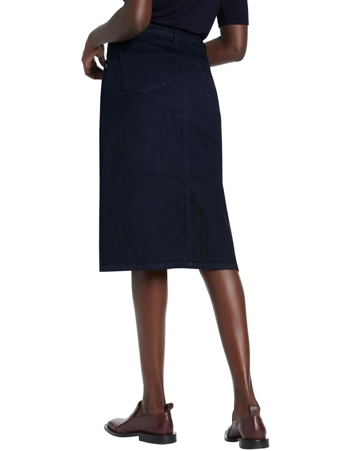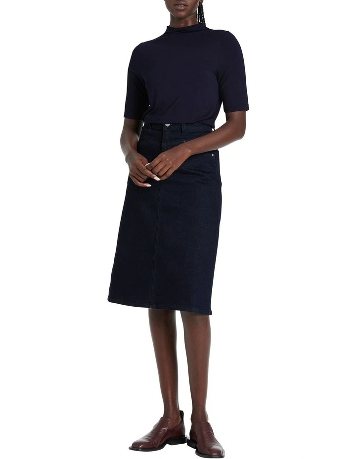 This seasons essential styling piece, this denim skirt descends from a neat fit mid rise through flattering A-line shaping to midi length. Dark indigo in colour, the skirt is made from Eco Wash denim with slight stretch for movement, completed by seam shaping through the yoke, angled pockets at the hip, patch pockets at the rear, and a button and concealed fly front closure.