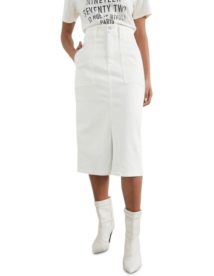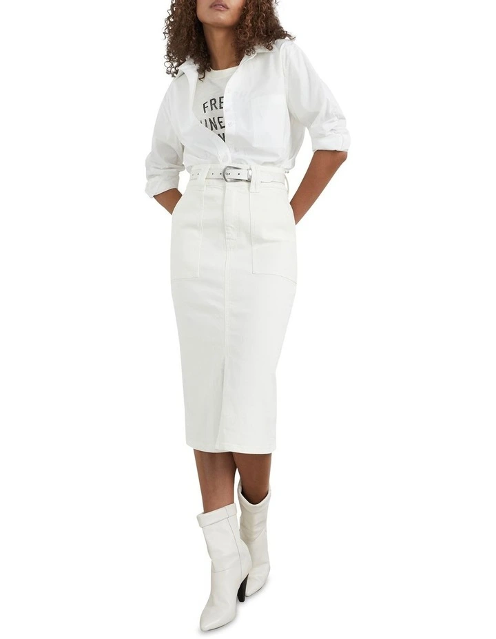 The Denim Midi Skirt offers a versatile look across the seasons. Made from a comfortable stretch cotton blend denim fabric, this midi-length skirt features front and back pockets, belt loops, button and zip closure, and a French Connection branded leather patch. Pair with our French Vintage Slub Tee and Harper Boot. Our model wears a size AU 8/XS. She usually wears a standard AU 8/XS, is 173cm tall, and has a 81cm bust, 94cm hips and 64cm waist.