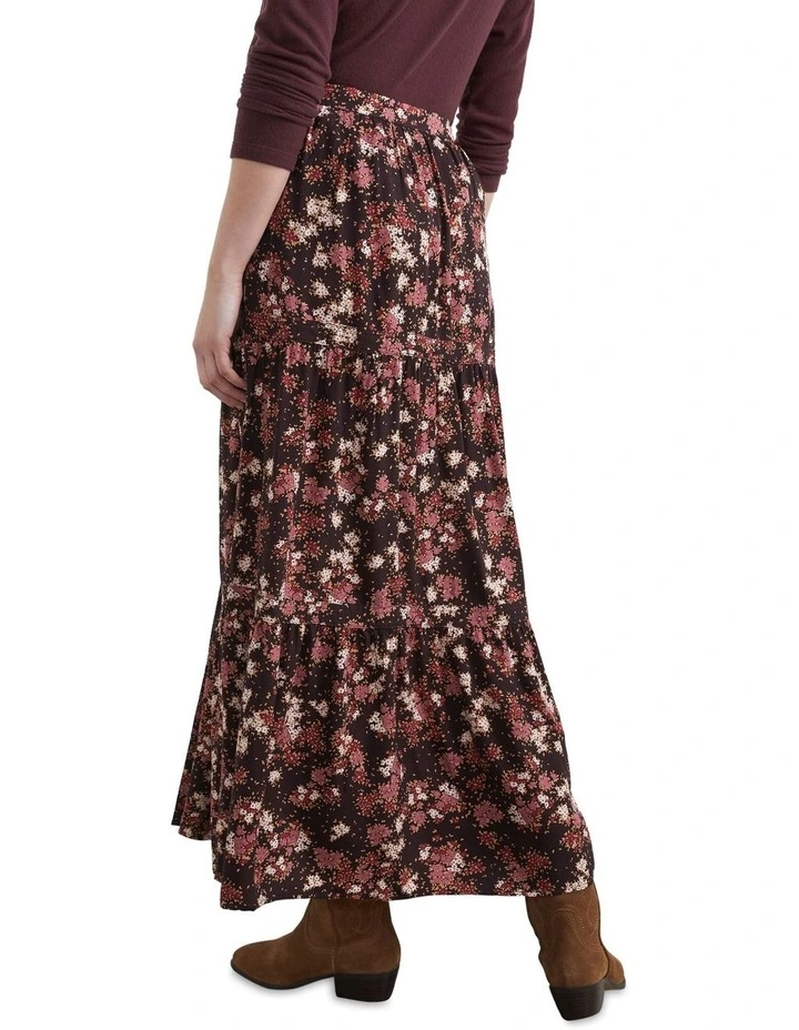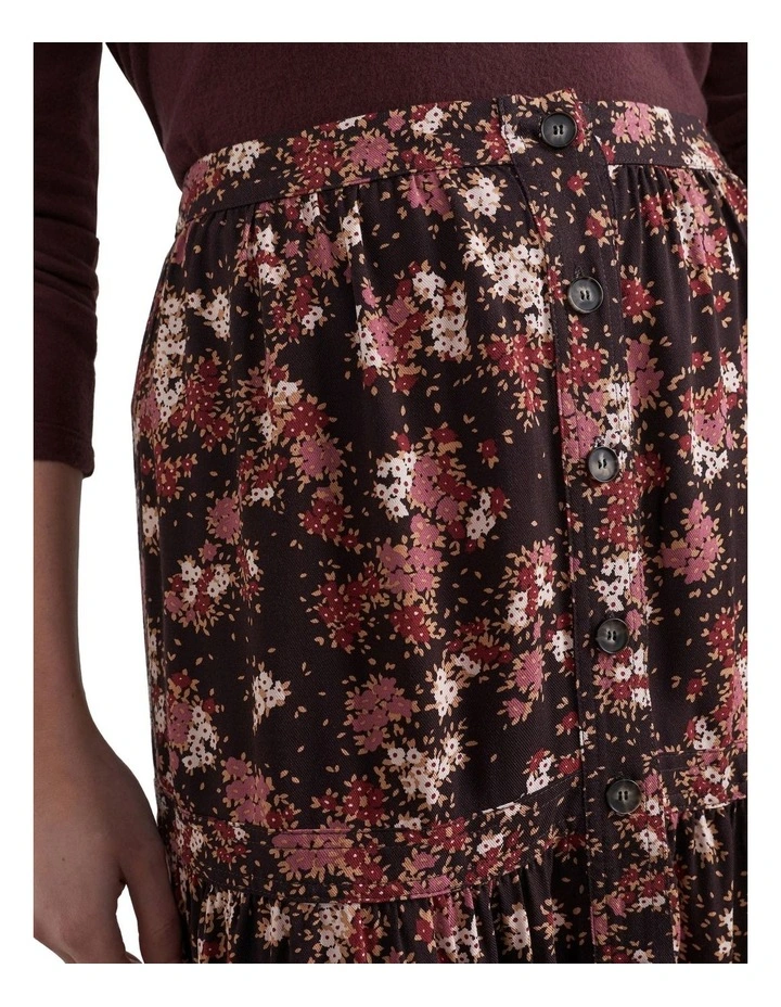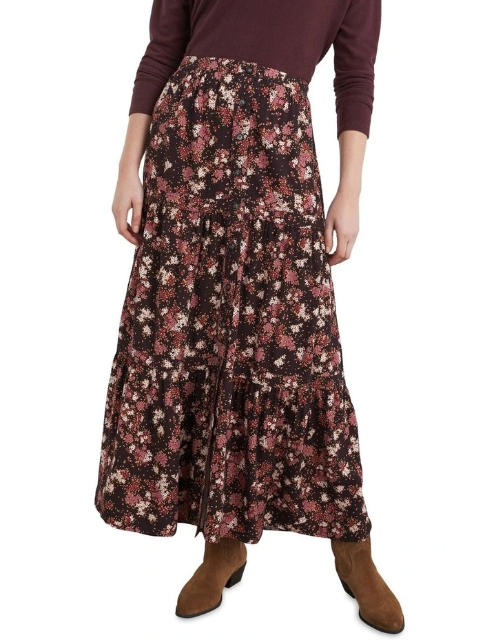 Our Floral Tiered Skirt is a beautiful statement piece. With an elegant floral pattern, relaxed fit and tiered silhouette, this midi length skirt is elevated by a button through design. Pair with our Cosy Long Sleeve T-shirt and Alexa Western Leather Boot. Our model wears size AU 8/XS. She usually wears a standard AU 8/Extra Small, is 180cm tall, and has a 86cm bust, 95cm hips and 69cm waist.