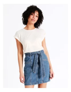Style a chic everyday look with a denim skirt. This skirt has a straight design and boasts a sash at the waist for an adjustable silhouette. Wear it with your best white tee for the perfect off-duty outfit.