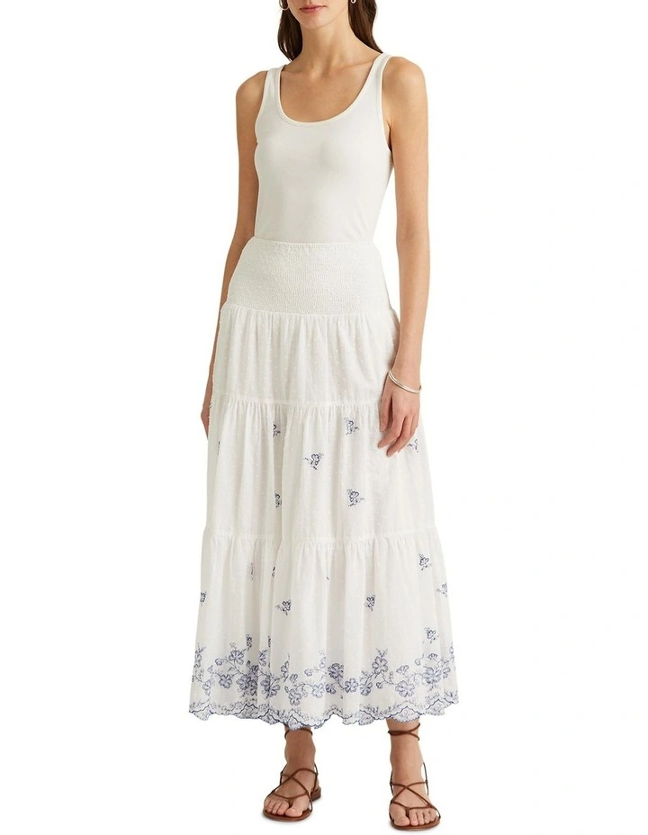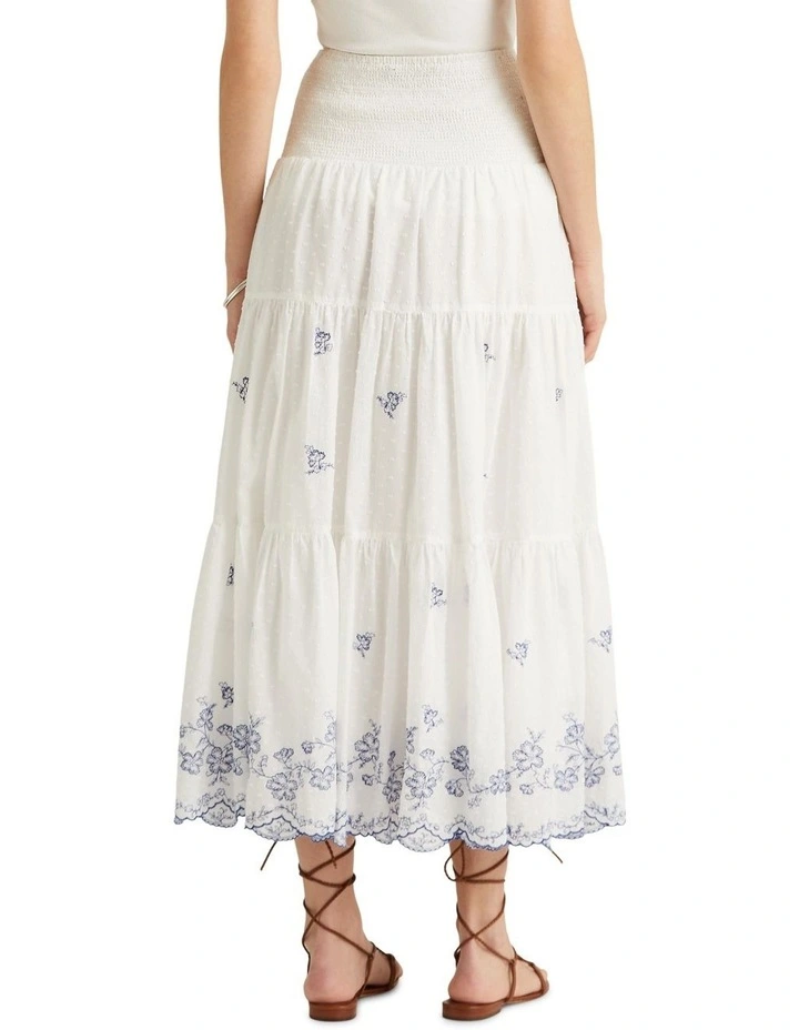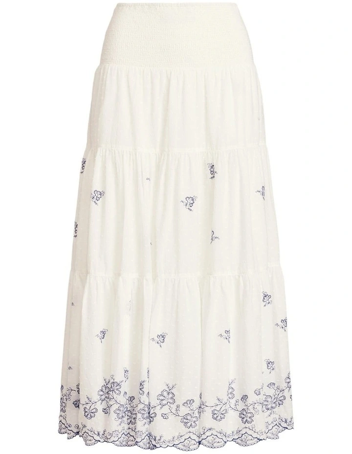 Dainty floral embroidery and a fluid tiered silhouette lend to the effervescence and femininity of this ethereal skirt, which is crafted from dotted cotton for added texture and an airy finish.