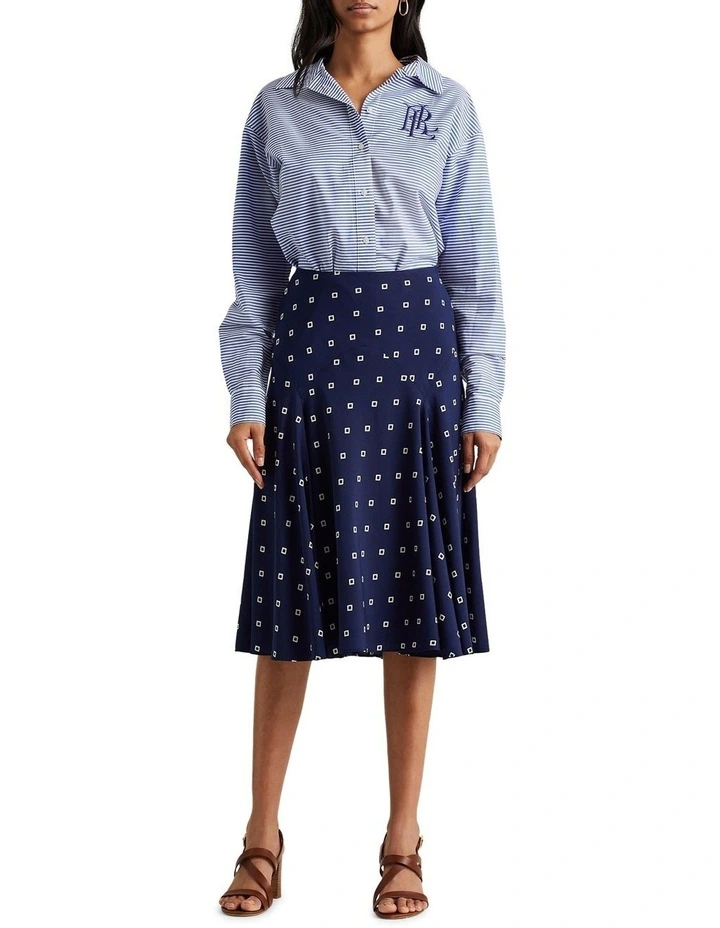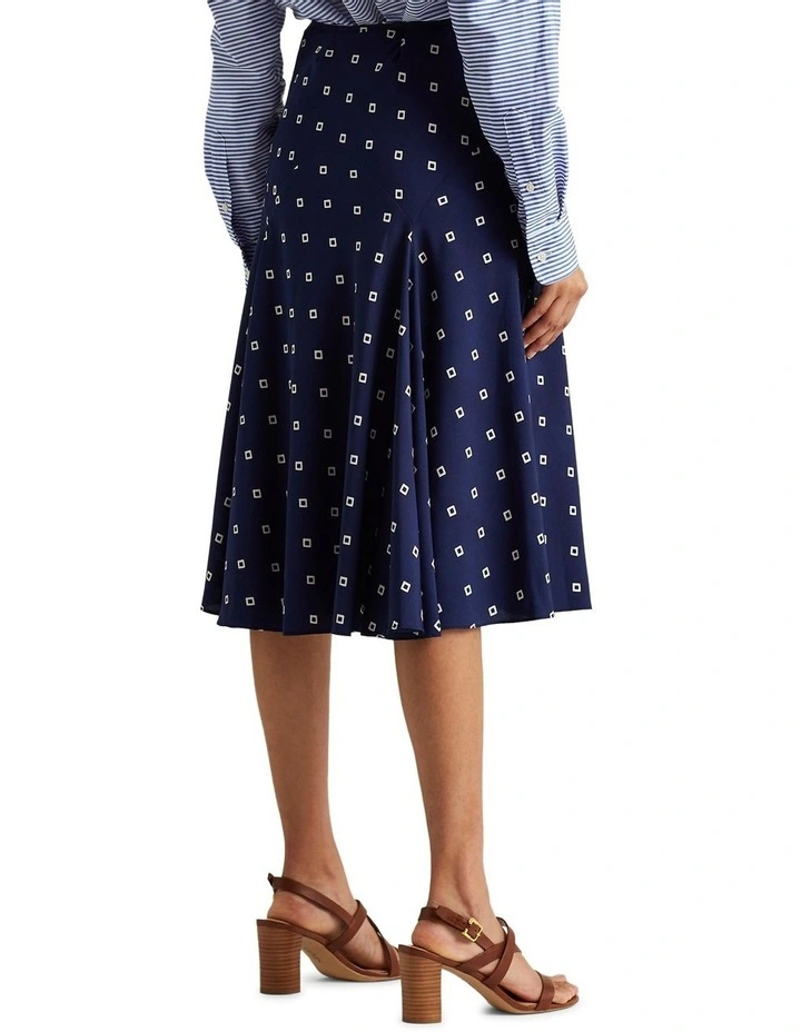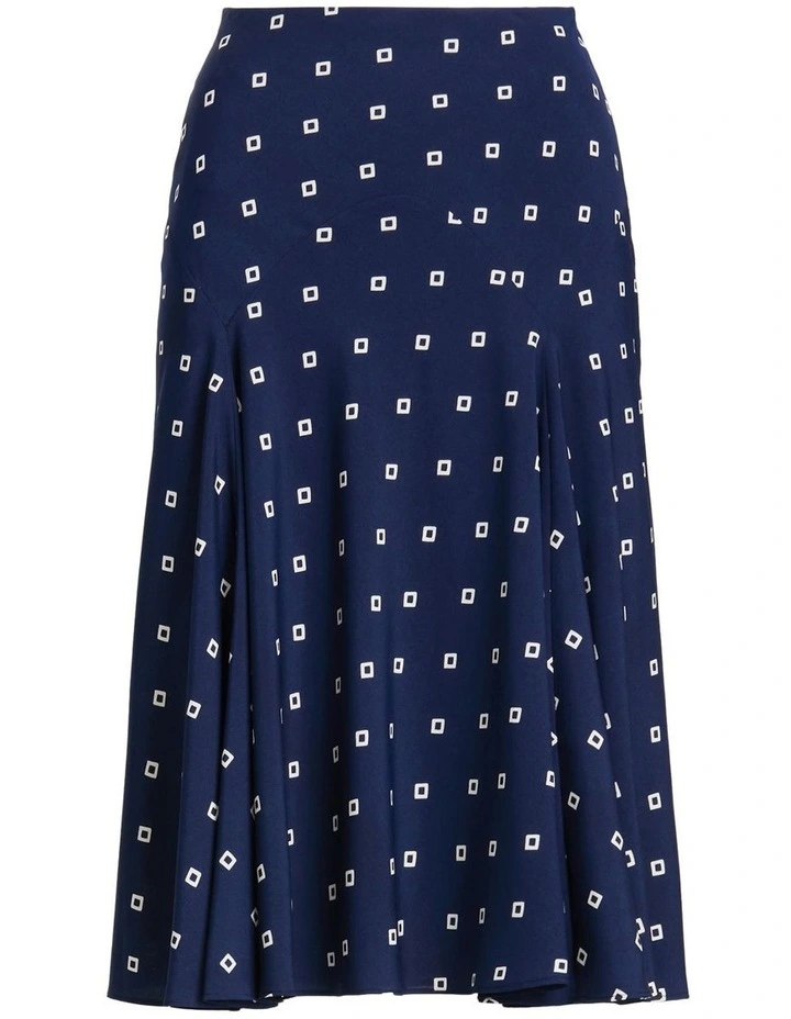 Crafted from lightweight crepe for an effortless drape, this sweeping peasant skirt features a godet panel for ease of movement, while an Art Decoinspired diamond print provides a luxurious finishing touch.