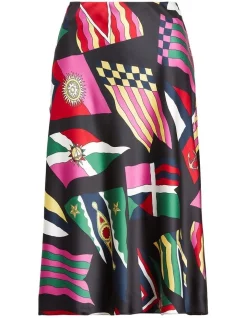 The silky hand of smooth satin and a calf-skirting silhouette give this skirt an effortless, elegant look. A nautical-inspired flag print updates it for the season.
