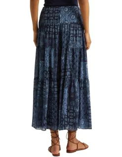 The silky hand of smooth satin and a calf-skirting silhouette give this skirt an effortless, elegant look. A nautical-inspired flag print updates it for the season.