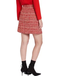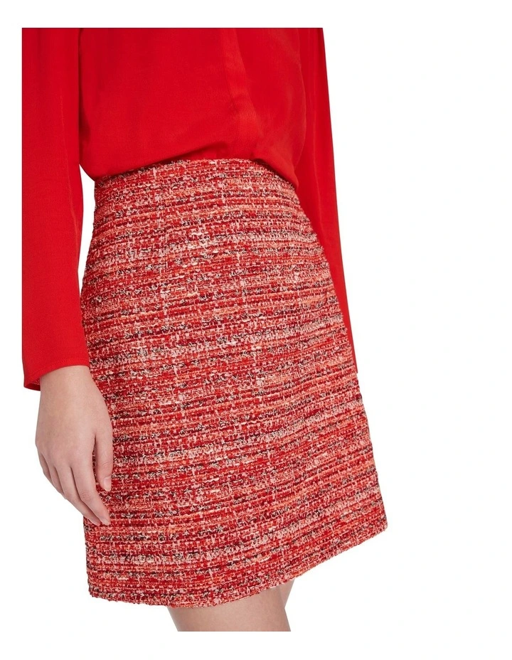 Beautifully textured, this mini skirt reveals a scarlet jacquard stripe with metallic accents, made from a soft cotton-blend European fabric, which is fully lined for added warmth. Curving close through a neatly shaped waist, the skirt creates a flattering A-line silhouette, while retaining clean lines with zero pocketing and an invisible zip closure at centre-back.