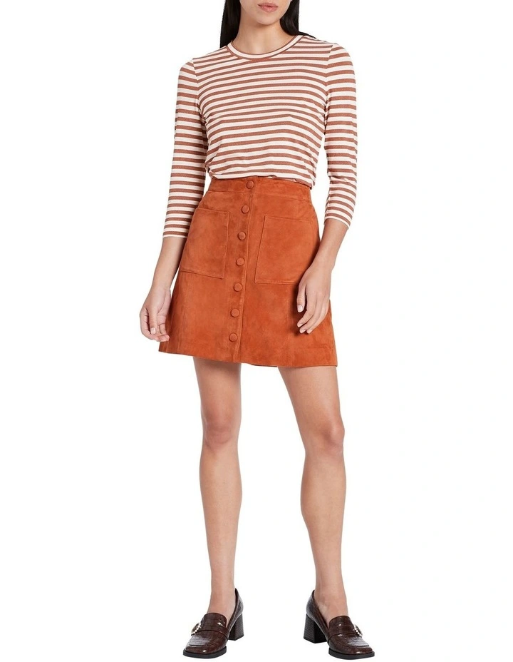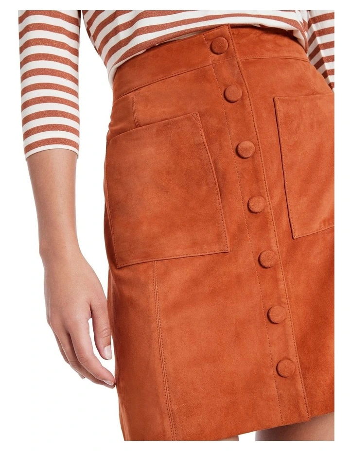 Soon to become an essential in your autumn-winter wardrobe, this mini skirt reveals a flattering A-line silhouette, made from soft suede leather in a gorgeous rust colouring. Fully lined for ease of movement, the skirt descends from a fixed waistband to fasten at the front with suede-covered snap buttons, finished with feature patch pockets at the hip.