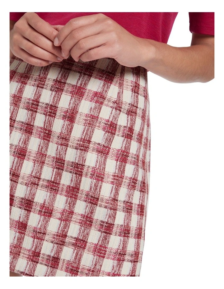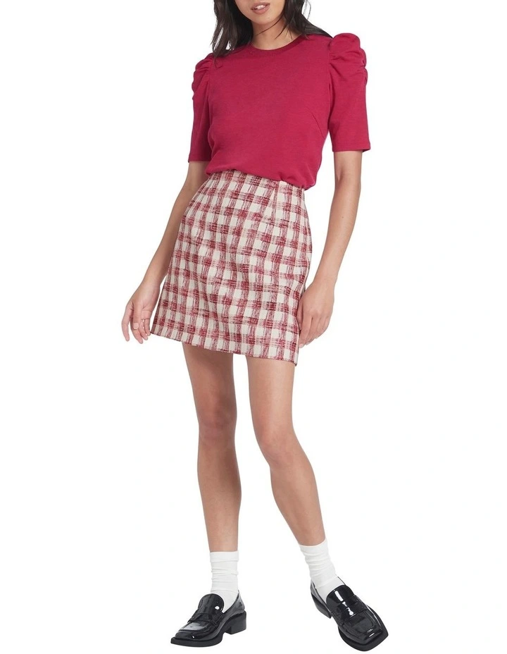 Flaunting pink and ivory within a metallic accented jacquard plaid, this mini skirt moves easily through an acrylic and cotton blend, featuring full lining for comfort. Fastening at the back with an invisible zip closure, the skirt descends from a concealed waistband to retain clean lines through a flattering A-line silhouette.