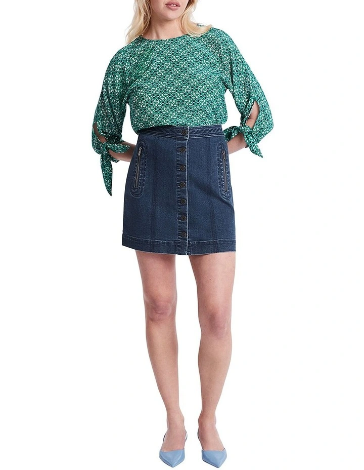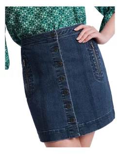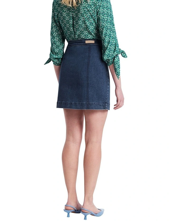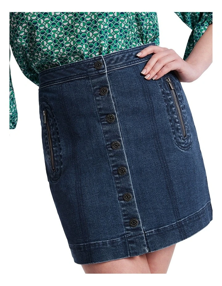 Curving close through neat A-line shaping, this denim mini skirt offers great stretch within a flattering fit, thanks to its stretch Australian cotton fabrication. Using an eco-friendly Dystar process to deliver a beautiful vintage blue, the skirt is further enhanced by a full button front fastening featuring Marcs branded buttons, and feature faux zip pocket detailing at the hip.