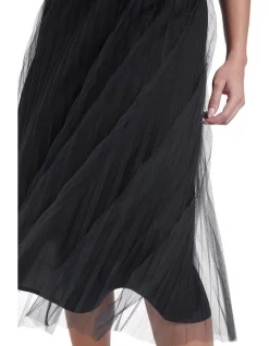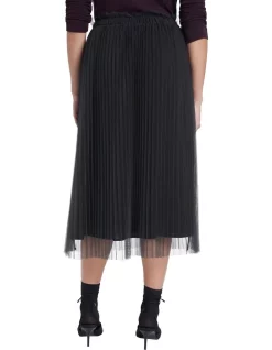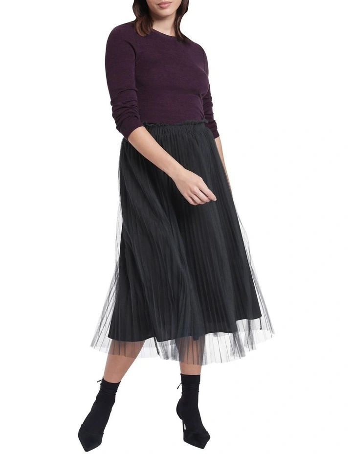 Lightweight and layered, this captivating skirt features a floaty pleated tulle layer over a straight underskirt lining to midi length. Charcoal in colour, the skirt utilises an elasticated waistband to create an effortless pull-on style, finished with a small gathered frill along the top of the waistline.