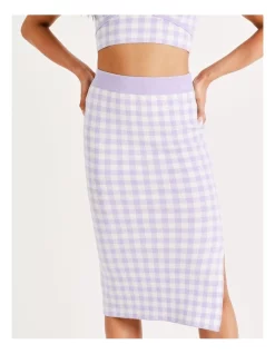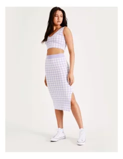 Add a pop of colour to your look with a lavender midi skirt. This skirt has a gingham check design, with a side split and mid rise cut. Style it with the matching crop for a playful co-ord look.Β
