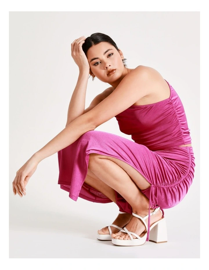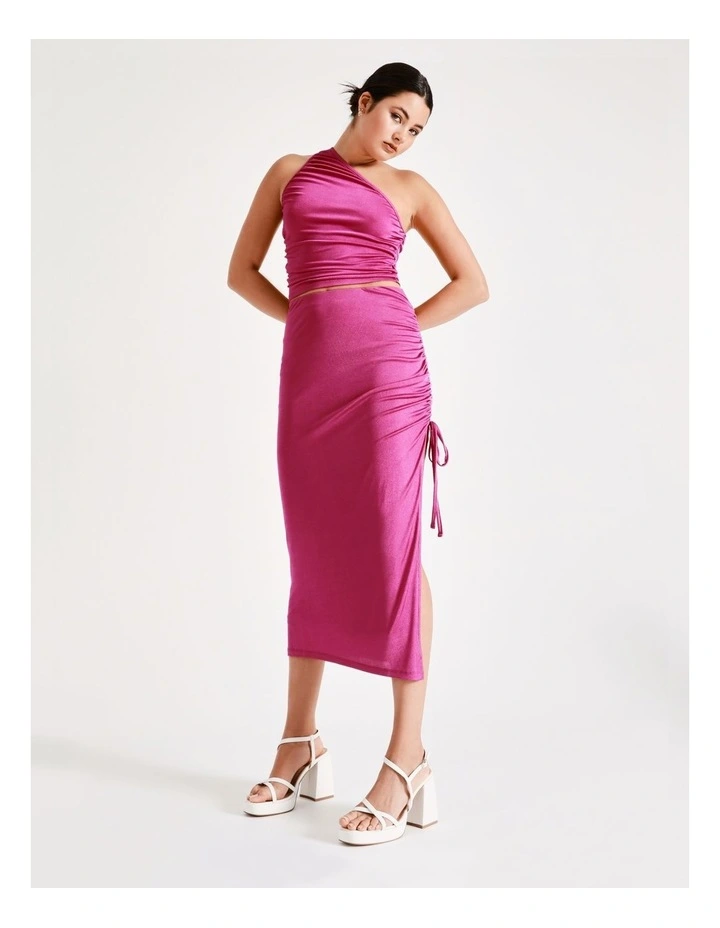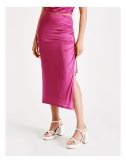 Get ready for your next event in an on-trend midi skirt. Chic and stylish, this skirt has a fitted design with ruching and a side leg split. Wear it with the matching top for a chic co-ord look.Β