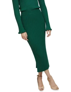 Comfortable and elegant, the Ana Rib Knitted Maxi Skirt is a versatile and easy to wear style. This knitted skirt is crafted from a ribbed knit weave giving it a stretchy, figure-hugging fit. It has a wide waistband and long side splits. Team it with the matching Elle Rib Crew Neck Knit and your favourite heels.Β