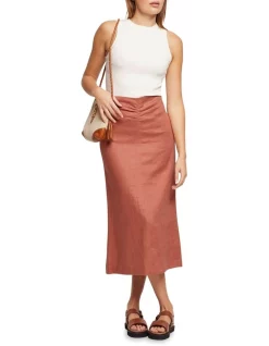 The Camilla Linen Skirt is a sleek and subtle look for work or play. This slim fit skirt is crafted from 100% linen for a soft and light feel. It features an invisible back zip, high waist and small ruching detail at the waist for a touch of flair. For effortless style team it with a basic tank and sandals.