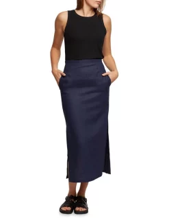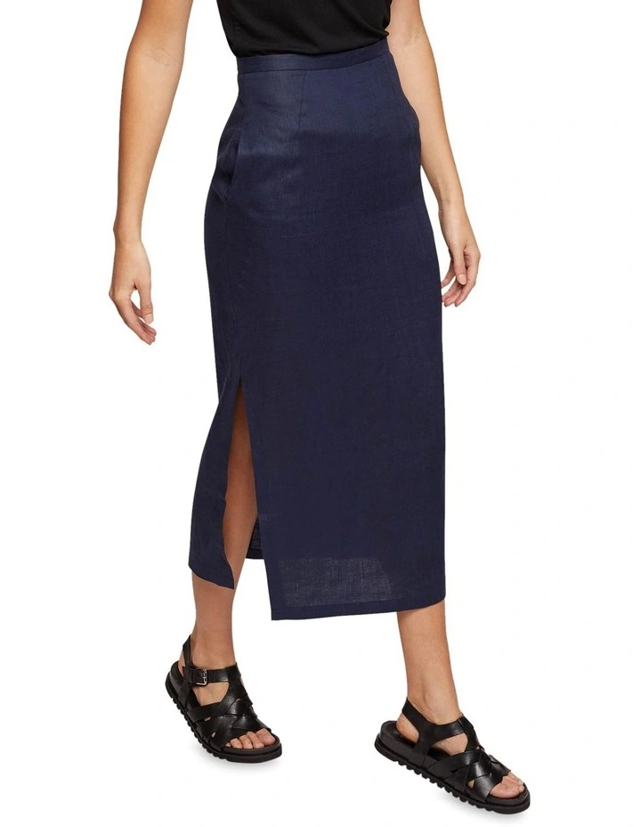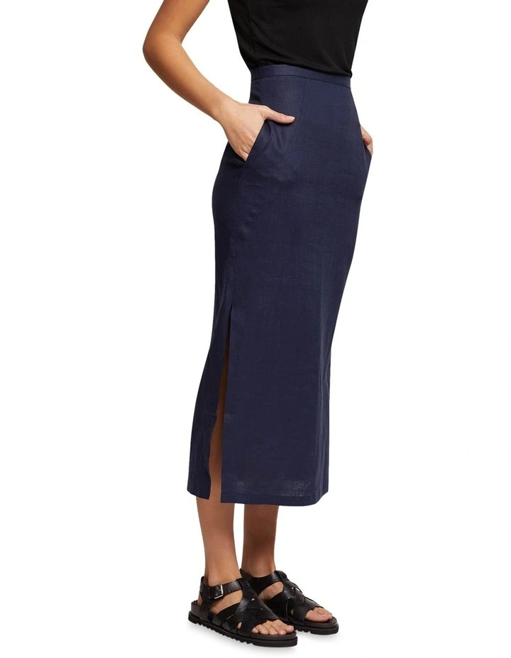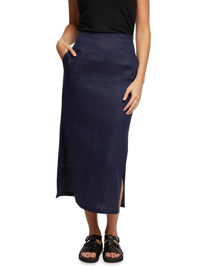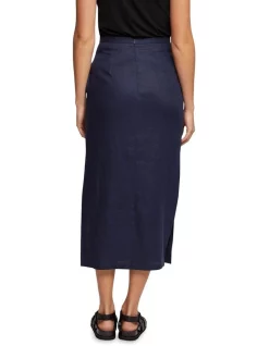 The Mia Linen Skirt is an effortless choice for work or play. This versatile skirt is crafted from a light and comfy linen in a classic navy colourway and features side pockets, invisible back zip and side splits. Style it with the matching Lola Linen Jacket and sandals to complete the look.