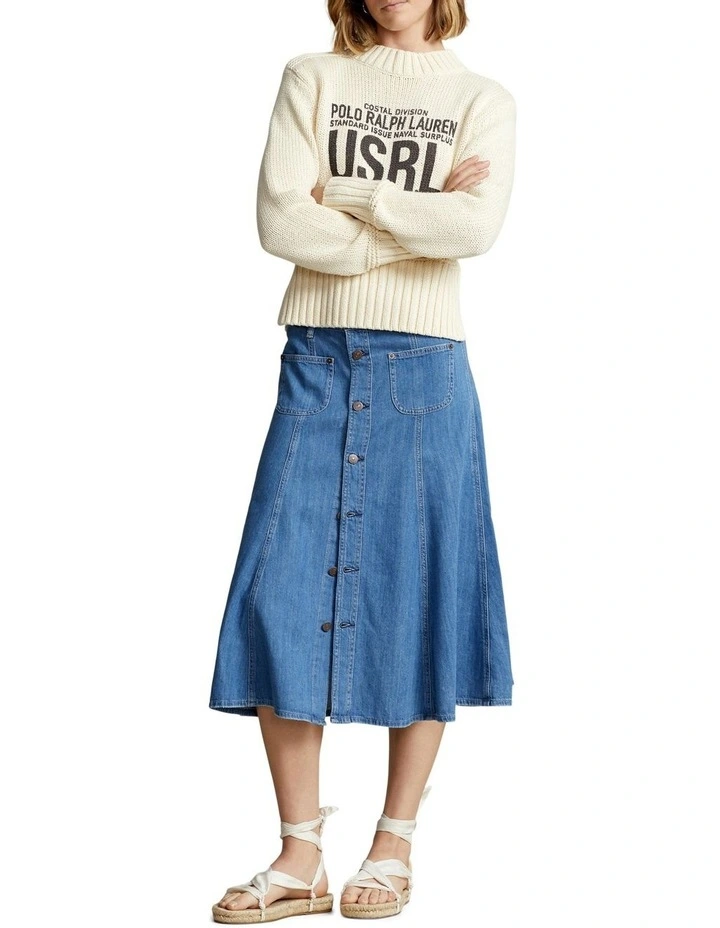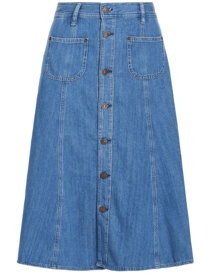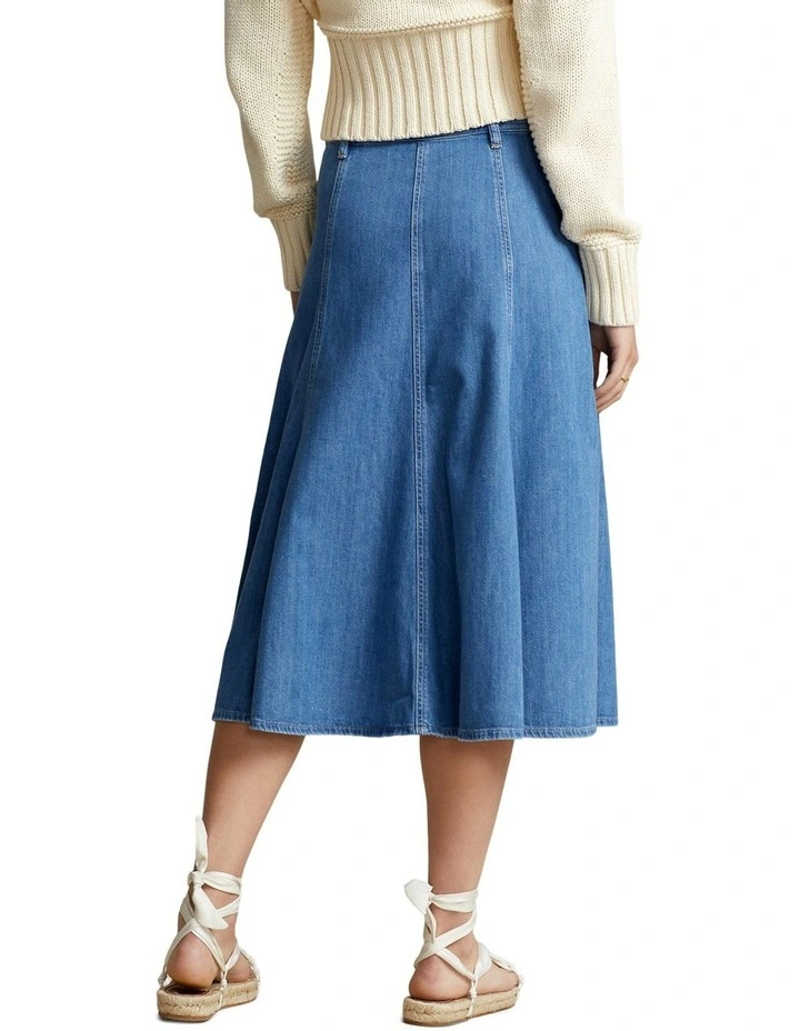 Balancing the effortless ease of denim with the timelessness of Polo Ralph Lauren style, this midi skirt is characterized by a button-front design and a calf-grazing, A-line silhouette.