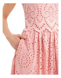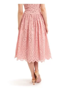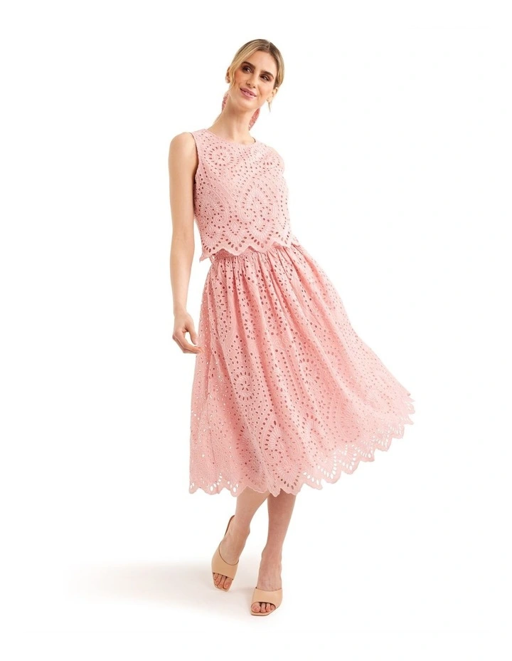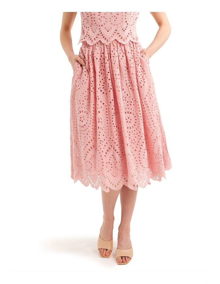 Cute summer styling made easy, the Isabella Broderie Skirt from Review is crafted from a lightweight natural fabric with broderie design, high waisted fit with back zip closure, side seam pockets and scalloped hem. This midi length skirt sits just below the knee. Style casually with a simple tee and tennis shoes, or dress up with heels.
