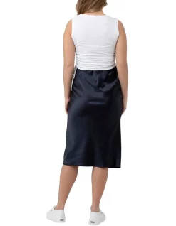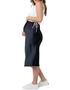 Our Lexie Satin Skirt is designed to sit high over the bump and is cut on the bias to create a flattering fit through throughout your pregnancy. Style with a cropped knit or a tied up tee.