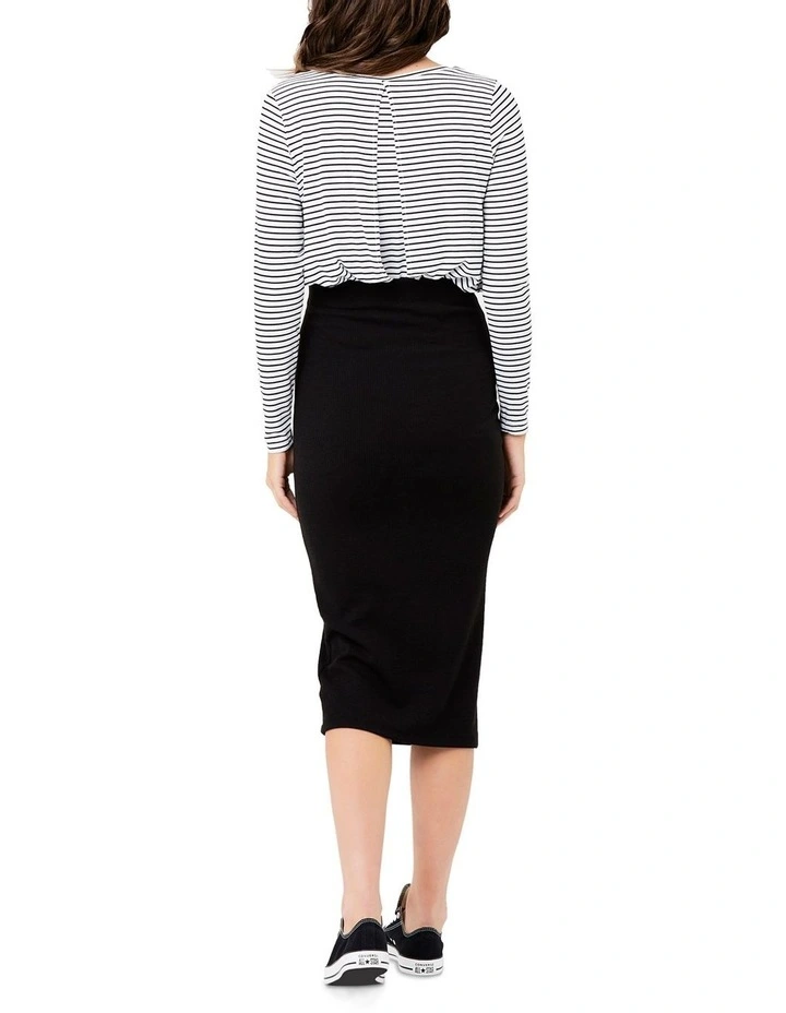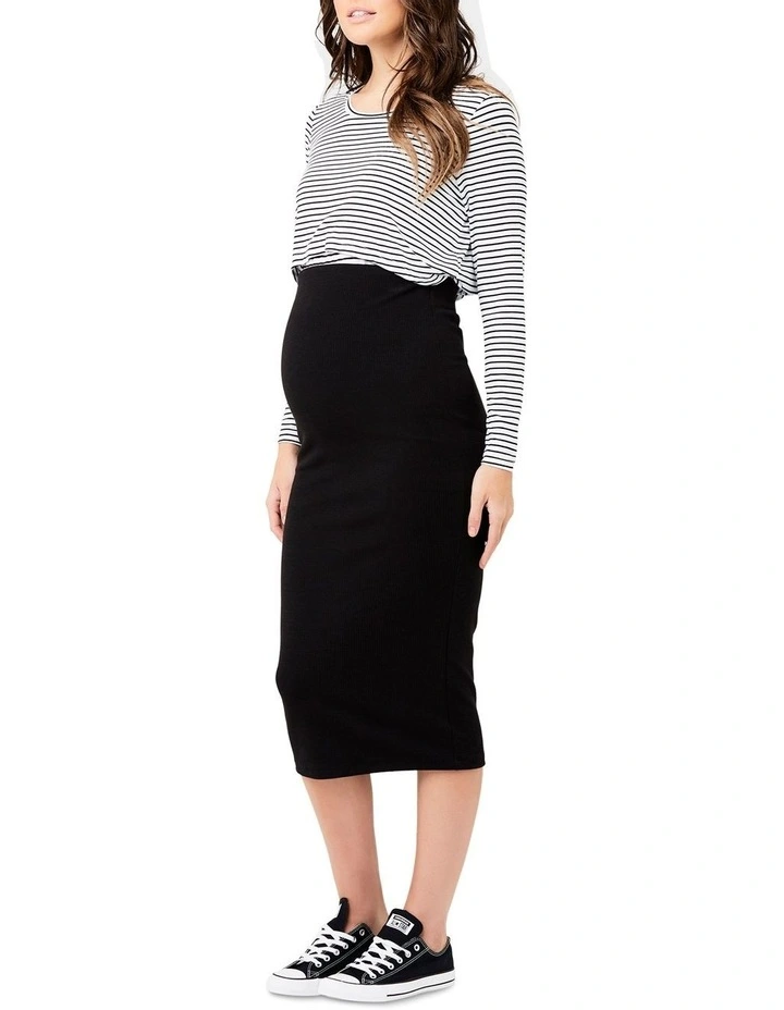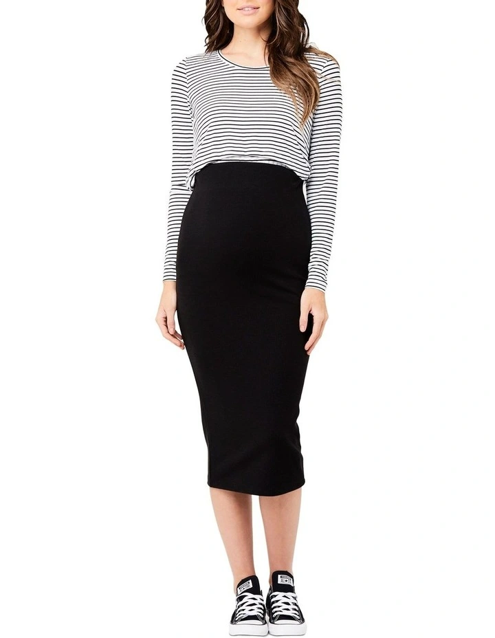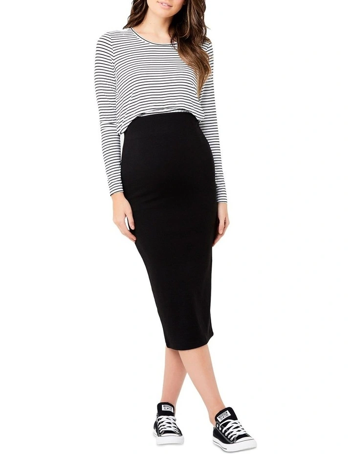 The figure flattering Ribbed Knit Pencil Skirt is the perfect piece for all stages of pregnancy. Worn high and over the bump, this skirt is a great choice for both the office and the weekend. Balance the fitted, slim silhouette with a cropped top like our Long Sleeve Ballet Top. Length: 80cm (size small) Cold hand wash separately