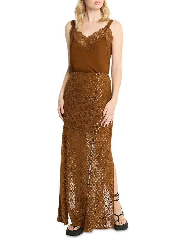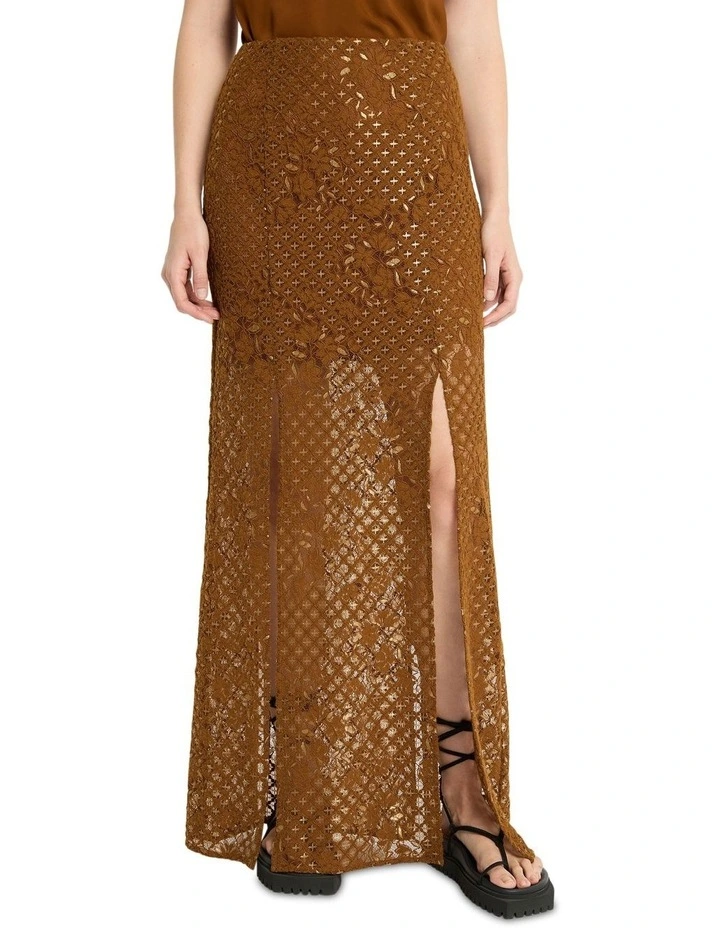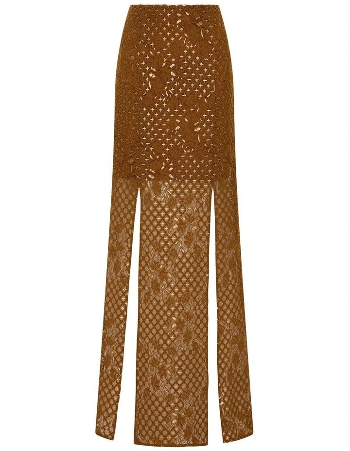 Curving over the hips from a natural waist position, this skirt skims softly through a slim silhouette, to fall to a flattering maxi length with feature splits that follow its panel lines front and back. Looking gorgeous in rich chocolate, the skirt creates a semi-sheer effect in delicate, metallic-accented lace, worn over a mini skirt lining that fastens at the side with an invisible zip.