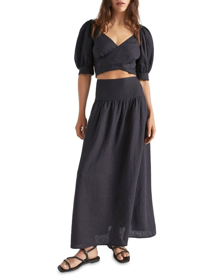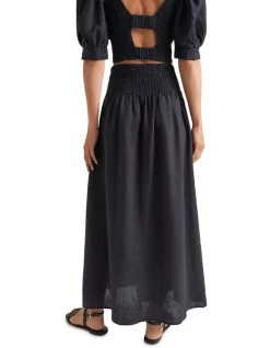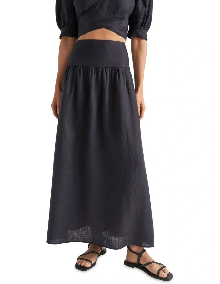 This 100% linen skirt will pair with any top for an easy outfit. The soft material is gathered, and swings into a full silhouette. The skirt features a drop yoke style waistband, with a shirred panel at the back for a comfortable fit.