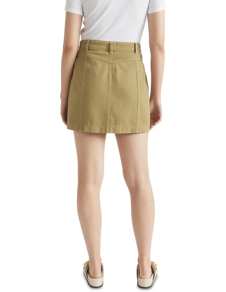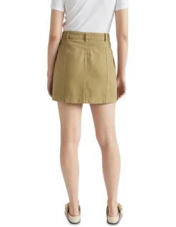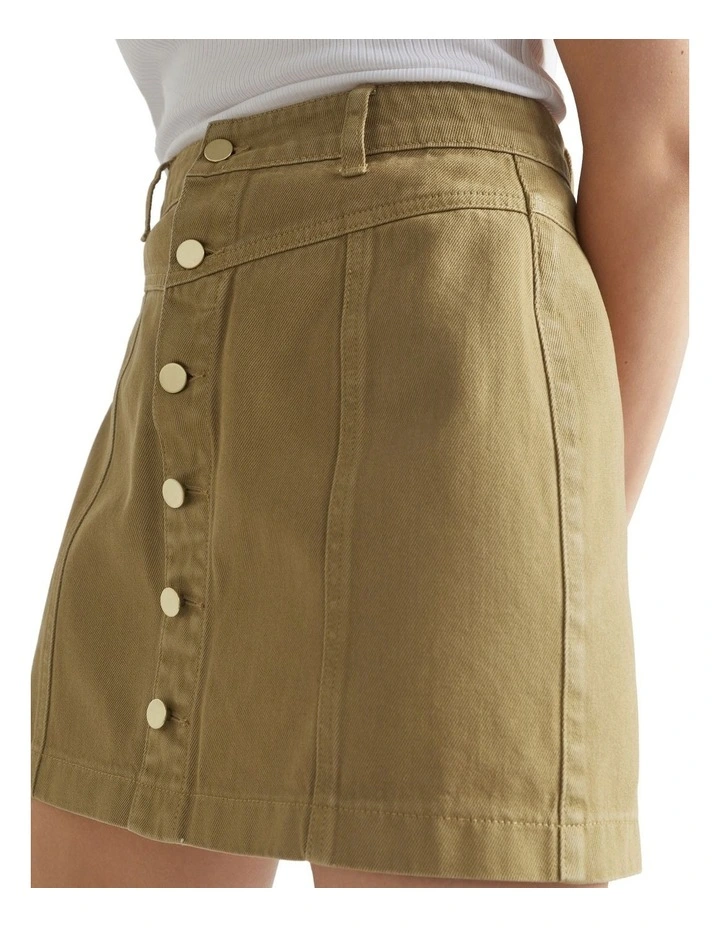 With an A-line cut and a button-front design, this mini skirt has a 1960s charm. It is made with panel details and brushed gold hardware, and belt loops for styling options.