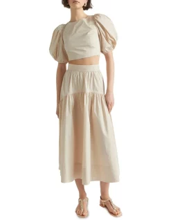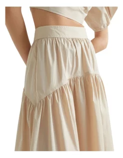 With an inverted yoke at the waist and a full, gathered cut, this skirt is a winner for the warmer months. It falls to a midi length and is crafted from a sateen cotton blend with just the right amount of stretch.