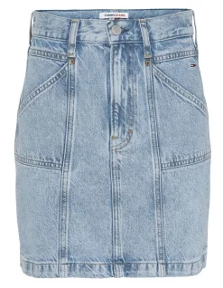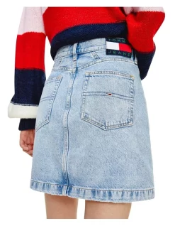 The washed denim fabric and flattering mom fit silhouette give this casual mini skirt a strong retro vibe.Β Β