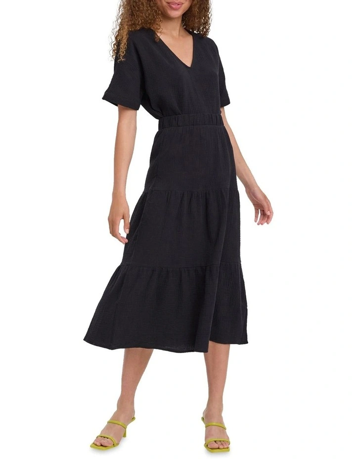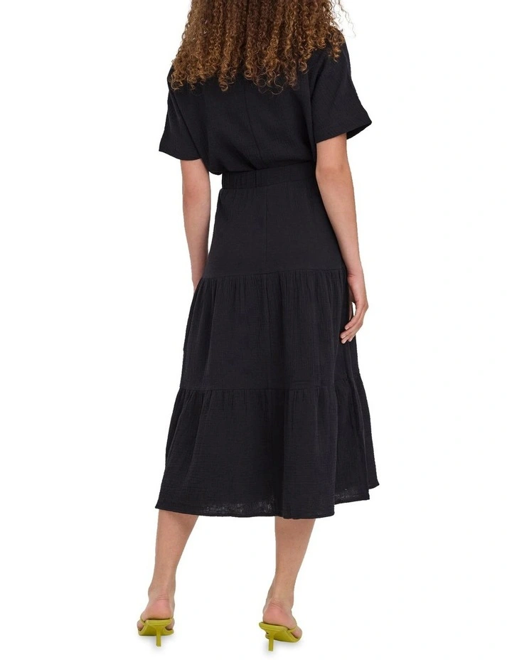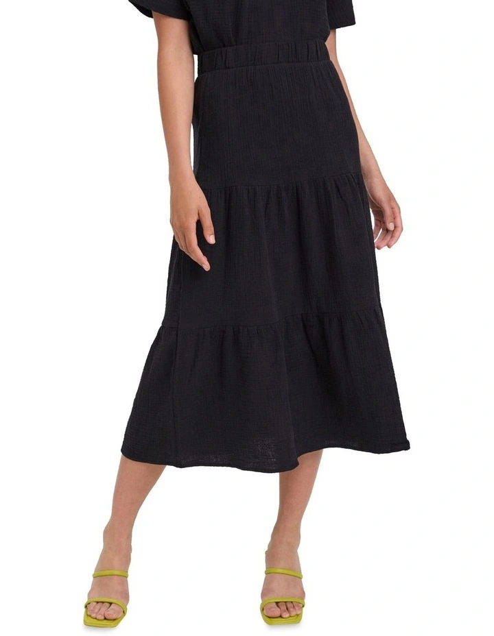 Maxi skirt with an elastic waist, tiered look, and high waist. Style this cute skirt with a singlet top and a pair of sandals for a simple, everyday look.