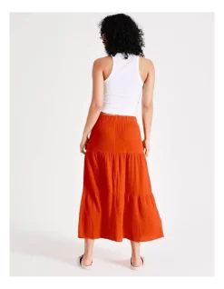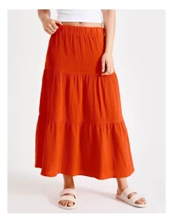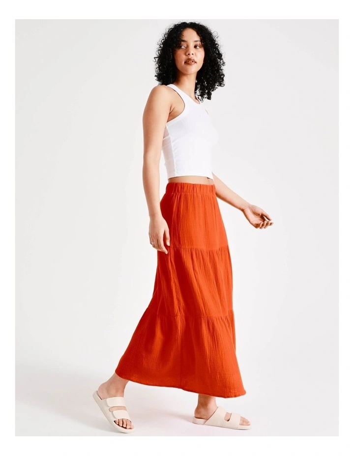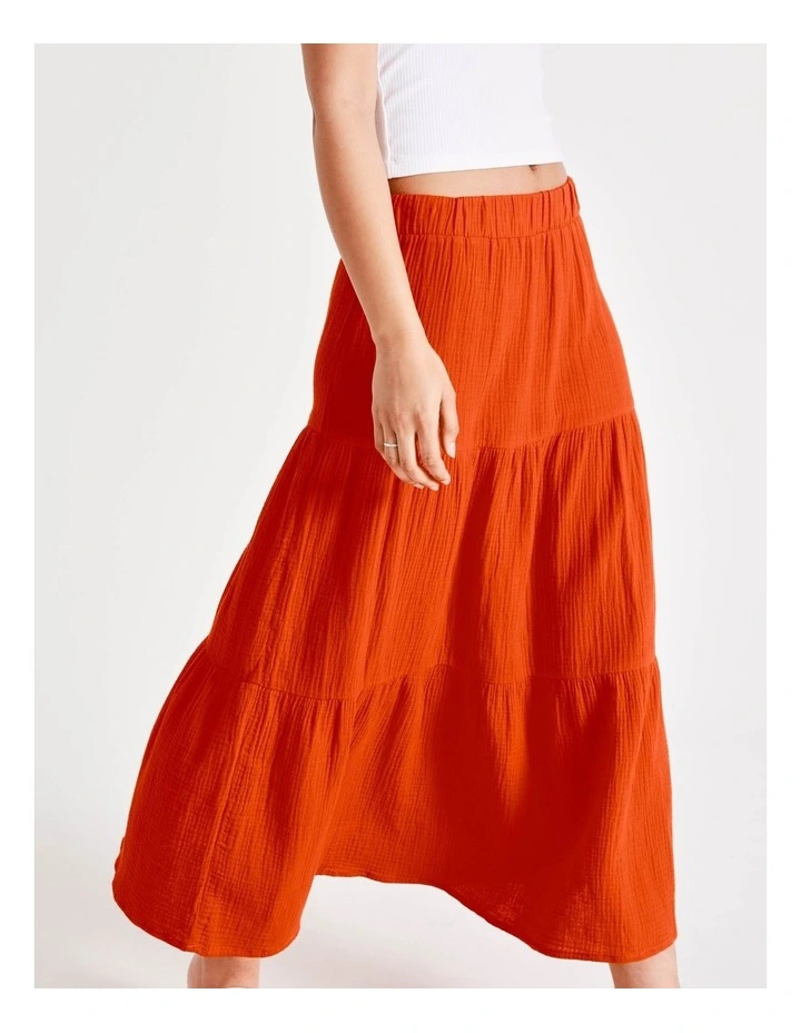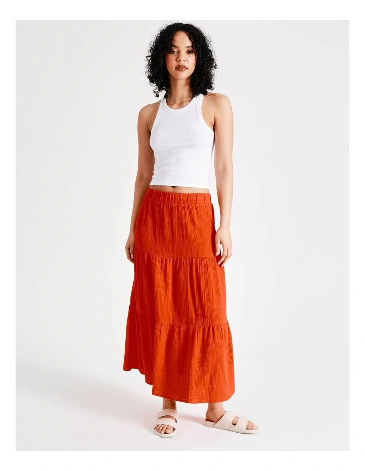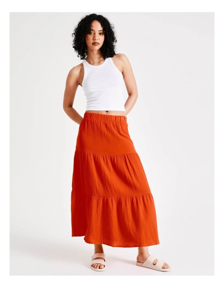 Midi woven skirt with an elastic waist, tiered look, and high waist. Style this cute skirt with a singlet top and a pair of sandals for a simple, everyday look.