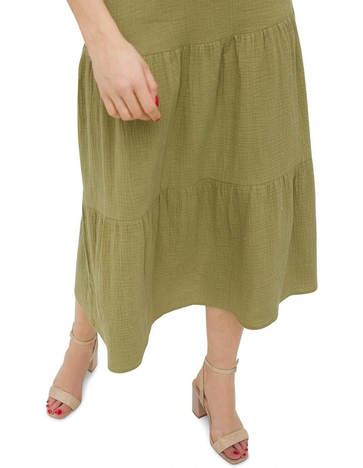Midi skirt with an elastic waist, tiered look, and high waist. Style this cute skirt with a singlet top and a pair of sandals for a simple, everyday look.