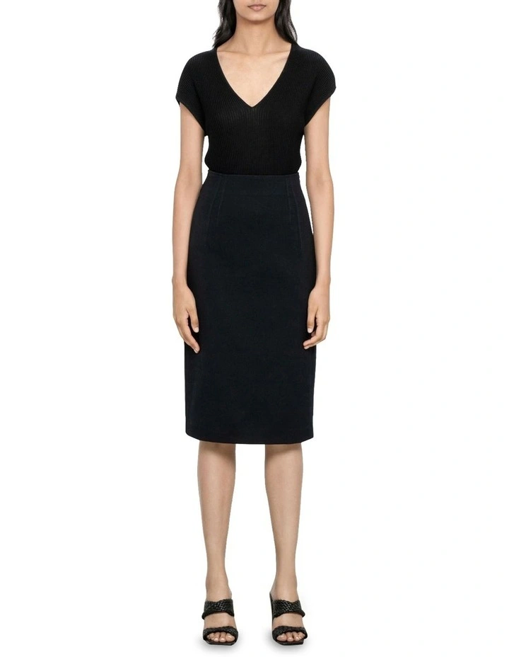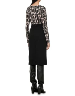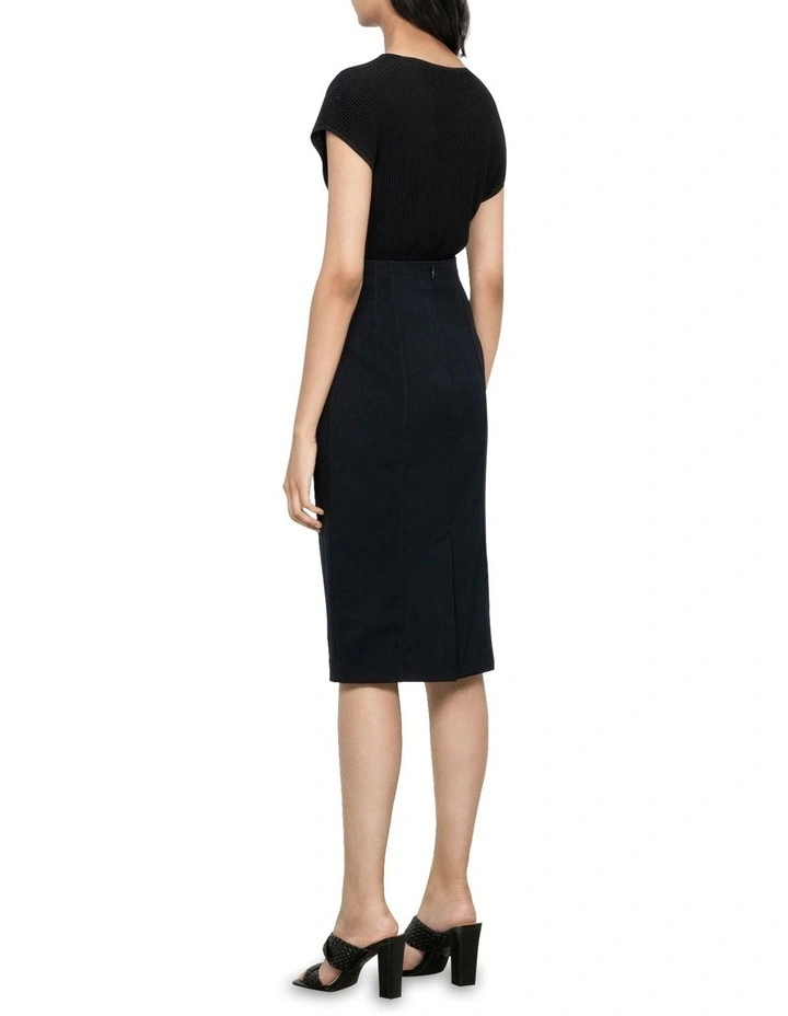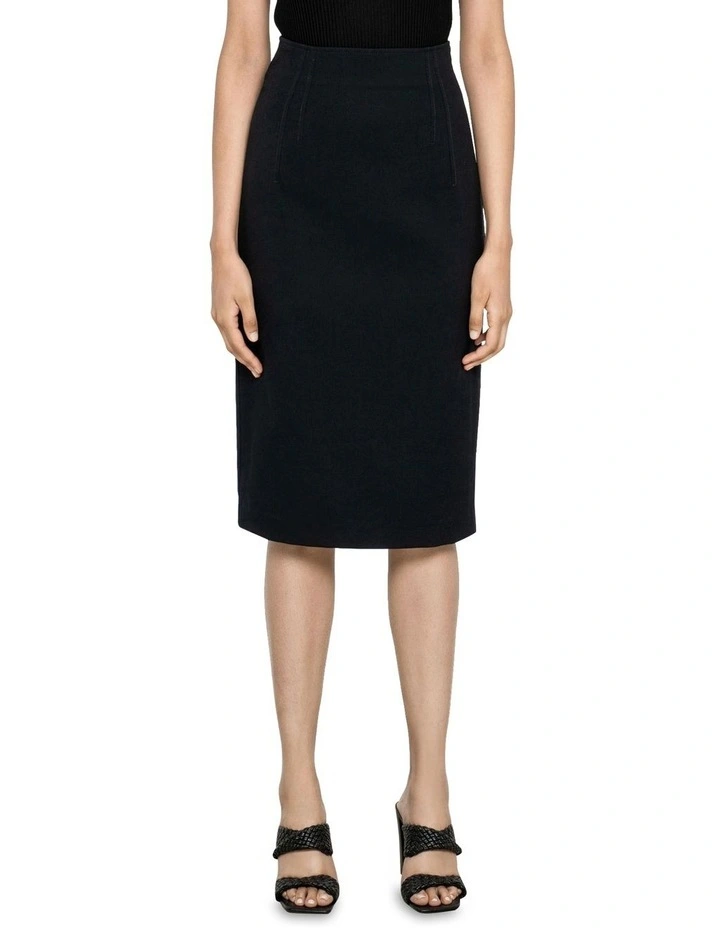Featuring a close fit though the body, a below the knee finish and flattering tuck details at the waist, this is an ideal skirt for pairing back with one of our knitted tops. Finish with knee high boots for a contemporary look.