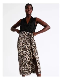 Leave a lasting impression in a statement midi skirt. This skirt is decorated with a striking ocelot print, with a stylish wrap design. Chic and sophisticated, it’s perfect for day to night wear.